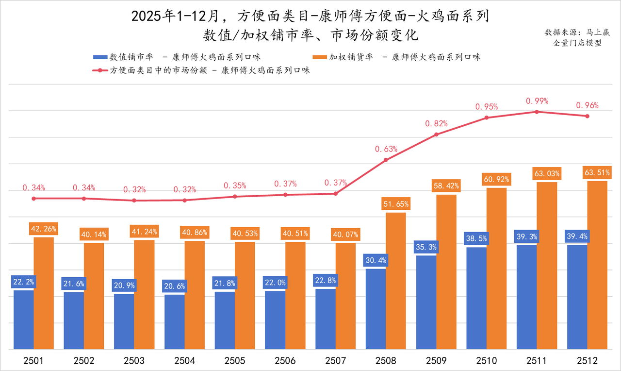 2025年7月起,康师傅火鸡面系列的数值铺市率和加权铺市率双双开始明显上涨,此后几乎每个月都在“上台阶”。铺货率的变化反映在市场份额上,下半年两者数值增长节奏高度吻合。