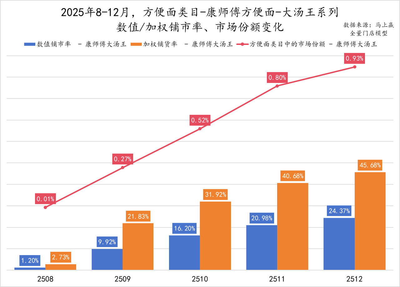 通过渠道能力快速发力的不止火鸡面,还有康师傅大汤王系列产品。作为今年全新推出、主打好汤的产品系列,大汤王自2025年8月上市以来,市场份额及铺市率均成长显著。