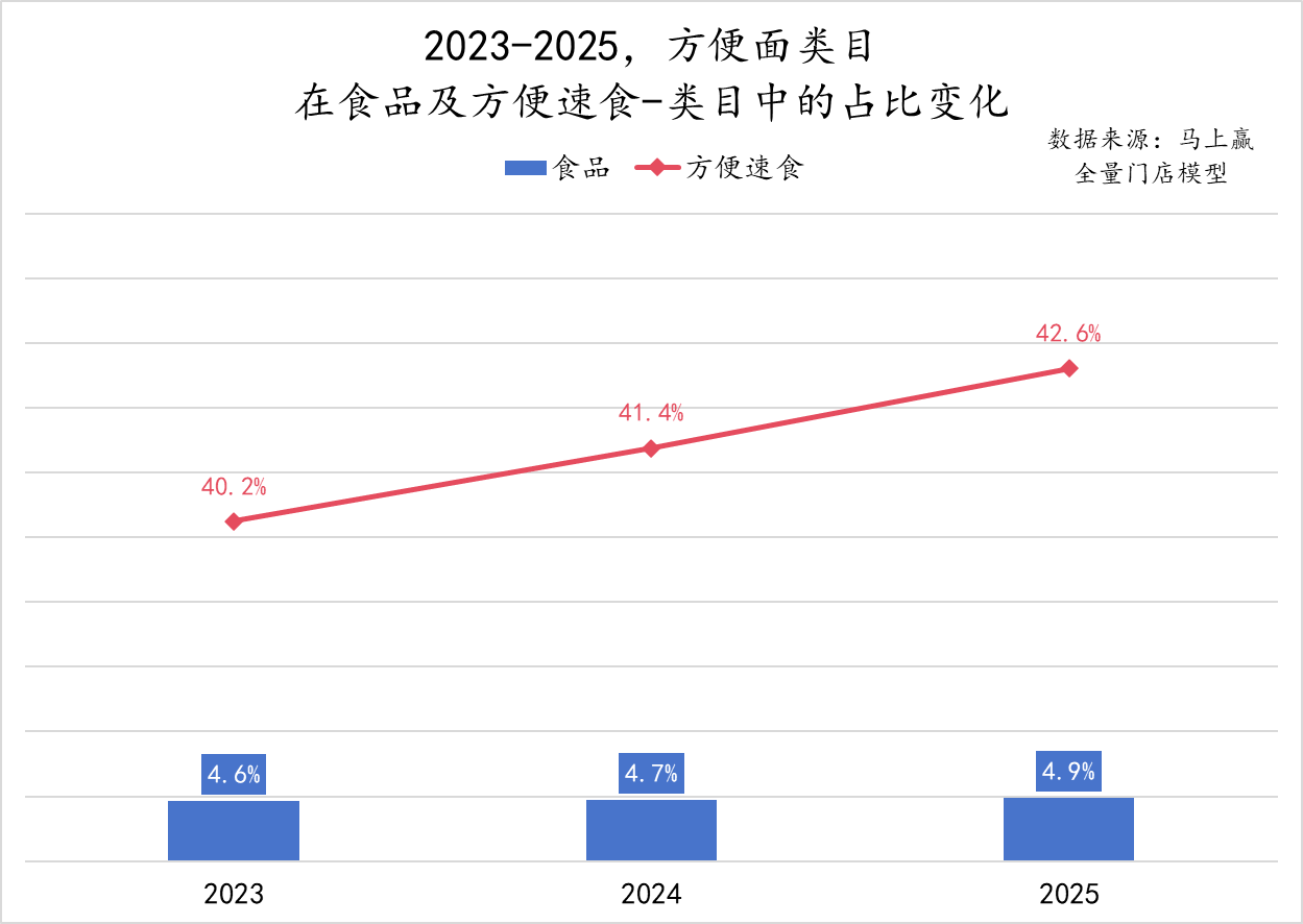 马上赢数据显示,2023年至2025年,传统线下零售渠道中,方便面类目在食品大类中的销售额占比近5%,在方便速食类目中占比则超过40%,实打实的数据表明:方便面不仅没被外卖干掉,反而在零售渠道中的重要性还在进一步提升。