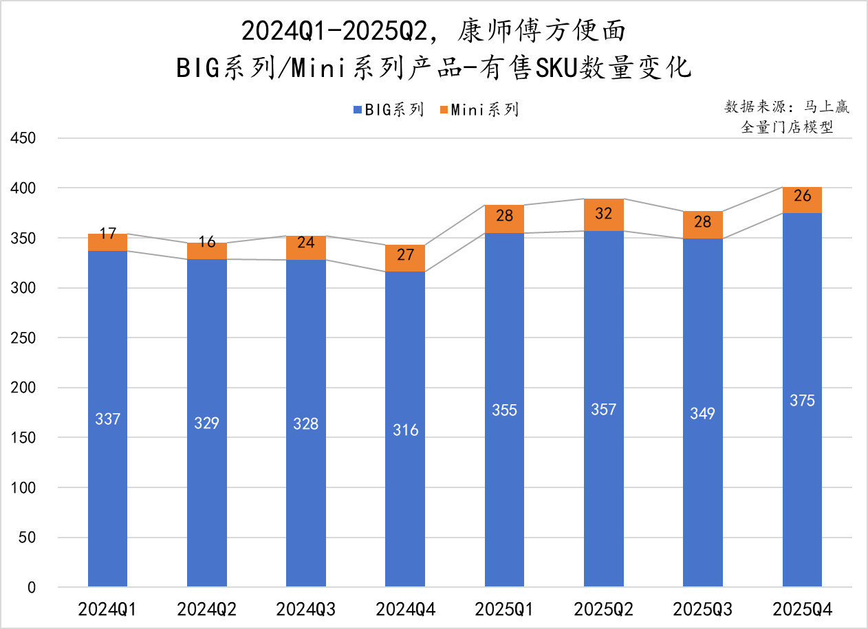 可以看到,从2024年到2025年,对应大/小规格的BIG系列、Mini系列,SKU数量都有波动增长,BIG系列更加主打大份量、吃饱吃好,Mini系列则比常规规格份量稍小,适合零食、解馋等轻餐场景。