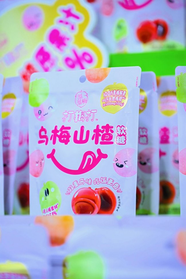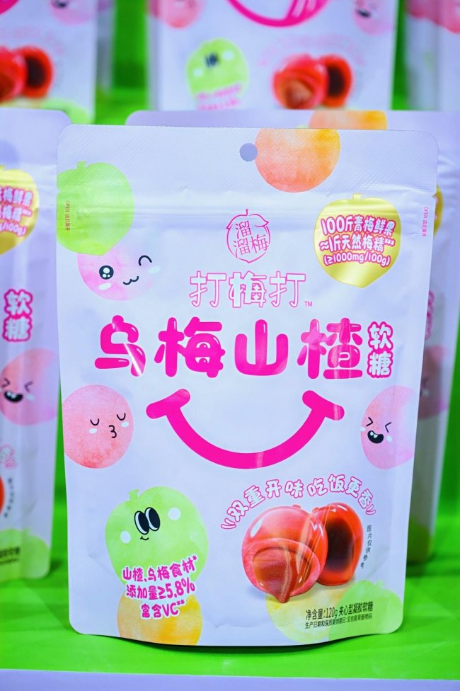 溜溜梅“打梅打”乌梅山楂软糖作为本届展会上当之无愧的明星产品,精准切入儿童开味零食细分赛道,以“双重开味、吃饭更香”为核心理念,甄选乌梅与山楂两大经典食材,实现“双味食养同源”。产品特别添加溜溜梅自研天然梅精(100斤青梅鲜果仅可萃取出约1斤天然梅精),其富含柠檬酸、苹果酸、丁二酸等多种成分,有助于促消化;乌梅、山楂食材的添加量也≥5.8%,保障了天然风味与营养。