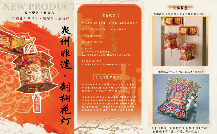 国文汇通联动福建泉州鲤城文投集团打造数字文旅活动,成为文化数字化在异地文旅场景的经典落地案例。本次活动以泉州非遗文化、城市符号为核心,推出国潮机甲IP《六合同风马》、非遗主题《刺桐花灯》数字文创作品,将数字文创与线下景区、文创店、电信营业厅深度绑定,实现“线上数字收藏+线下文旅消费”的闭环;平台以数字文创为纽带,既实现了泉州本土文化的年轻化传播,又以线下流量反哺线上平台,验证了“数字资产+实体权益”模式的可行性,充分展现了文化数字化落地的实际价值,也为跨区域文旅数字化转型提供了成功经验。
