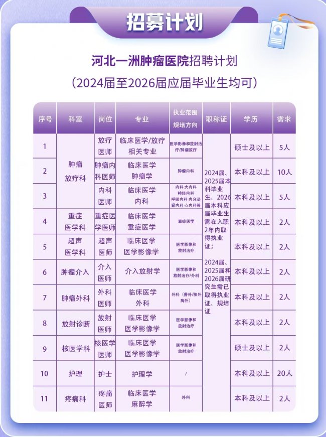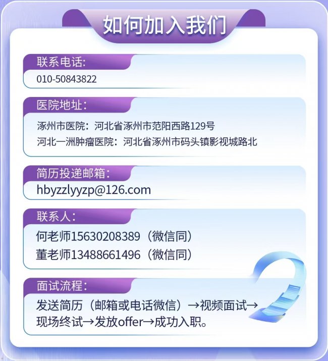 据介绍,本次招聘岗位覆盖面广,包括临床医师、医技人员及护理岗位等多个类别,尤其在肿瘤放疗、介入治疗、重症医学等关键学科方向加大引进力度。招聘流程采用“简历投递—线上视频面试—现场终试—发放录用通知”的方式,提升人才引进效率。联系方式:何老师:15630208389(微信同号)