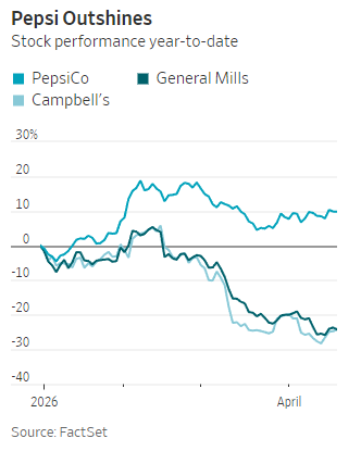 许多食品企业也在尝试类似策略,但可动用的资源远不及百事。通用磨坊、金宝汤均下调了今年的财务预期,业务销售额预计持续下滑。两家公司都在降价、加大投入以赢回消费者,却都未取得百事那样的市场反响。股价也反映出市场的质疑:今年百事股价上涨约 9%,而通用磨坊与金宝汤均下跌超 20%。