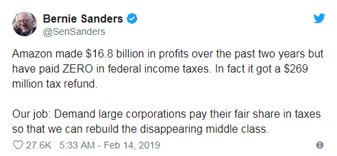 有可能成为2020年的总统候选人的桑德斯在推特上写道,“亚马逊在过去两年中获得了168亿美元的利润,但却没有缴纳任何联邦所得税。事实上,它获得了2.69亿美元的退税。我们的工作是:要求大公司缴纳公平的税款,这样我们就能重建正在消失的中产阶级。”