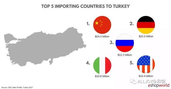 中国向土耳其提供了244亿美元的进口产品,包括从汽车到直升机等大型复杂商品。 土耳其的其他主要进口合作伙伴是德国(225亿美元),俄罗斯(122亿美元),意大利(108亿美元)和美国(104亿美元)。