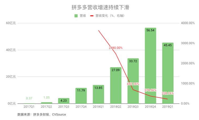 在今年1-3月中,拼多多营收为45.45亿元,同比增长228%。该增速大于同期阿里的51%和京东的20.9%。