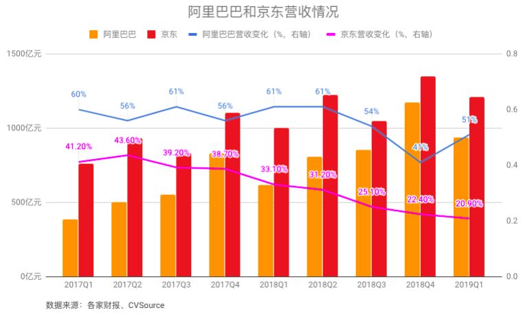 阿里巴巴字同样2018年营收增速持续放缓,尤其第四季度增速将为41%,是三年来最慢的一次。京东则从2017年第二季度开始,增速一路放缓,从当时的43.6%增速下滑至今年一季度的20.9%,少了近23个百分点。