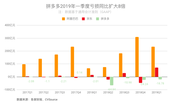 5月20日晚,拼多多最新发布的2019年一季度财报显示,营收为45.45亿元,高于市场预期的41.43亿元,营收比去年同期增长228%。归属于拼多多普通股东的净亏损,由去年同期的2.01亿元扩大8倍至18.78亿元。
