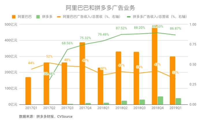 但到了今年一季度,这两家公司的广告收入与总营收的占比均有所下降。一季度拼多多收入39.484亿元,较2018年同期增长256%,占总营收的比例从上一季度的接近90%降为86.87%;而阿里巴巴收入301.19亿元,同比增长31%,占总营收的比例则从上一季度的42%降到32%。