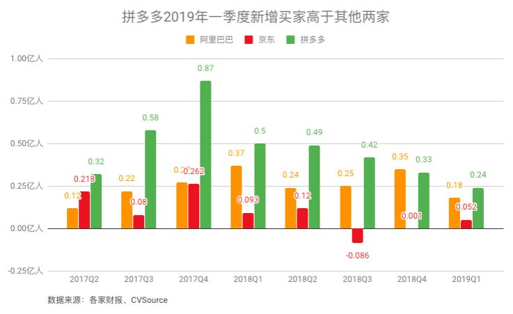 继上一季度落后于阿里后,拼多多新增活跃买家绝对值再次回到领先地位。2019年Q1,拼多多新增活跃买家2500万,而阿里同期为1800万。