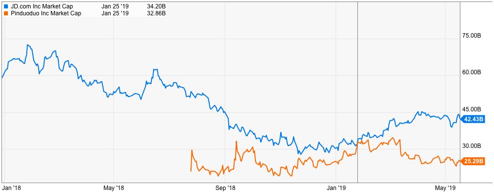 现在,京东已经从追一变成了保二。毕竟,今年1月25日,拼多多曾以320.1亿美元的市值短暂地超过了京东的319.8亿美元。当时受刘强东黑天鹅事件影响,唱衰京东的声音不绝于耳。不过此后京东股价震荡上涨,截至5月20日收盘,京东市值为410.52亿美元,拼多多市值为241.54美元。