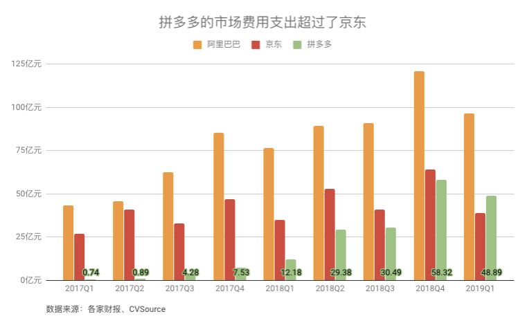 从2017年Q1到2019年Q1,拼多多市场营销费用从7400万元增长至48.89亿元。2018一年时间,拼多多花掉130.37亿元用来做市场推广。“拼多多,拼多多,拼得多,免得多。”不要嘲笑这句洗脑歌,这是拼多多把辛苦做起来的营收重金砸向市场的结果。