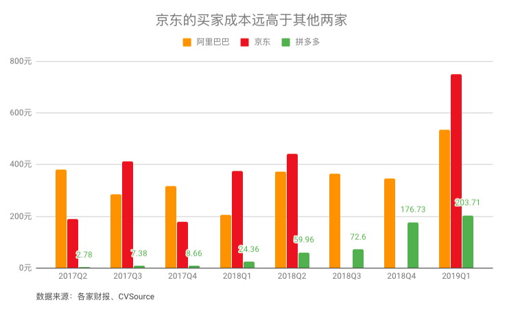 而现在,这种红利已经逐渐消失。2019年Q1,拼多多获客成本增长至203块,相较于阿里的获客成本差距正在逐渐缩小,而且其获客成本还在不断增长中。