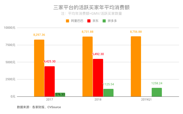 在买家用户规模上,拼多多已然超过京东,但是其用户价值不高,也即活跃买家的年度平均消费额太低,2017年、2018年年度平均消费额分别为576.33元、1125.34元,京东相差近5倍,和阿里相差8倍多。