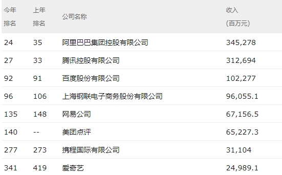 备受关注的BAT三巨头中,阿里巴巴与腾讯的名次均有所提升,但百度下滑了1个名次。