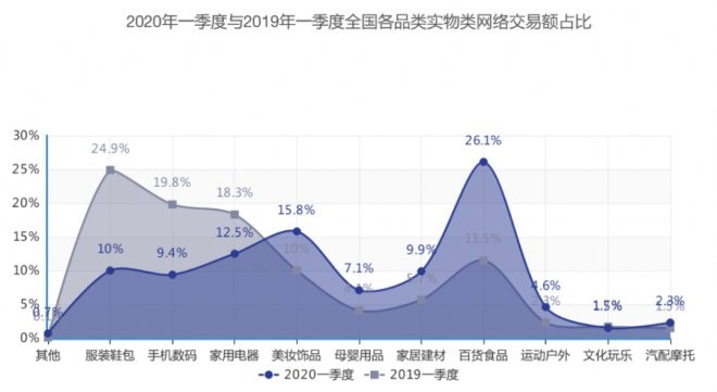 受疫情影响,今年一季度实物类网络零售品类发生巨大变化,消费类目由长期以来的占据主导地位的服装鞋包、手机数码、家用电器等向百货食品、家居用品等类目大规模倾斜和转移。服装鞋包、手机数码、家用电器三大网络零售品类交易受到较大影响。