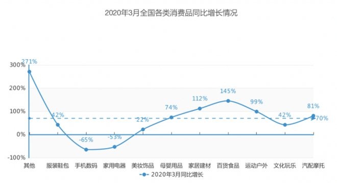 3月份对一季度全国实物类网络零售额增长贡献率高达56.5%。3月份国内疫情防控形势向好,各地大规模复产复工,成为一季度最关键月份,对一季度全国实物类网络零售额增长贡献率高达56.5%。亿邦产业云图3月份监测的11个消费大类中,在线上消费回升和替代线下消费的双重作用下,除手机数码和家用电器类目外,其他类目均同比增长20%以上,平均同比增长率达到70%。其中,服装品类由1-2月8%负增长转为42%正增长。