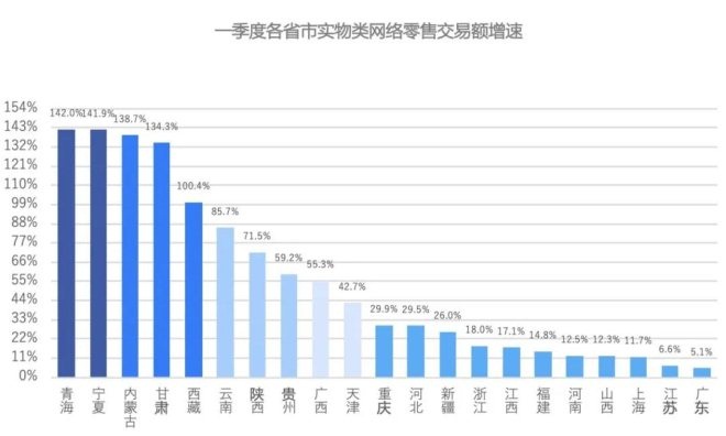 疫情期间西部省份出现100%同比增长,电子商务仍有巨大发展空间。一季度,青海、宁夏、内蒙、甘肃、西藏等受疫情影响的西部地区实物类网络零售交易额出现100%以上高速增长,远高于全国其他地区。从交易品类数据观察,青海、宁夏等地基本以百货食品等类目为主,但也显示出西部地区电子商务巨大的发展空间。