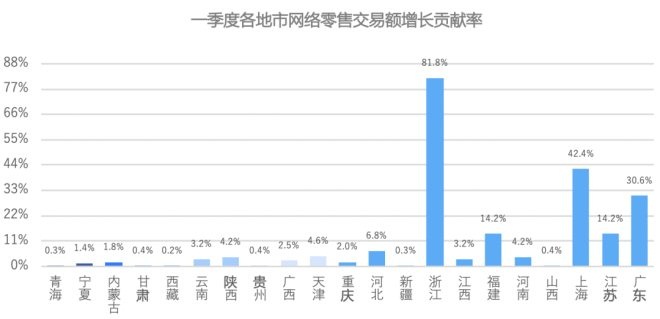 浙江、上海、广东、江苏、福建5省市对一季度全国网零额增长贡献达183%。其中浙江对一季度实物类网络零售交易额增长贡献率高达81.8%,拉动增长3.5个百分点。