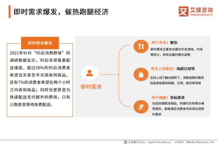 跑腿服务是随即时物流发展出现的非标准化服务,主要满足个人及本地个体经营者的同城配送及个性化需求。即时需求的爆发有益于跑腿经济的进一步发展。从餐饮外卖到零售用品,再到跑腿服务,消费者对消费的时效性要求正在不断提升,而跑腿服务包括同城取送物品、同城代买和帮办事等,能够满足消费者足不出户、节约时间的需求。