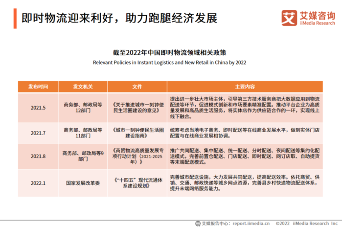 2021年-2022年,我国相继出台若干项支持即时物流发展的政策措施,旨在推动线下与线上高度融合发展,促进模式创新和市场要素精准配置,完善末端配送体系,提升末端网络服务能力。艾媒咨询分析师认为,跑腿作为同城服务行业增速最快的新兴赛道之一,在应对多元化消费需求中迭代发展,即时物流相关政策措施的实施将进一步促进跑腿经济多元化发展。
