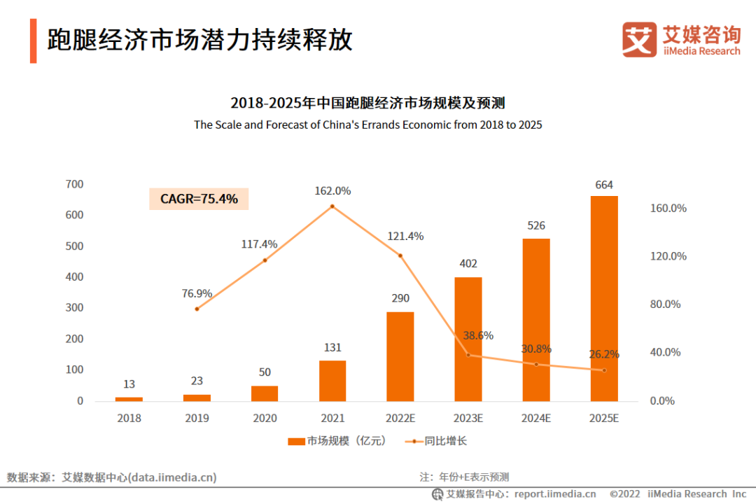 数据显示,2021年中国跑腿经济市场规模达131亿元。艾媒咨询分析师认为,随着消费者即时需求的持续增长,以及跑腿服务渗透率进一步提升,中国跑腿经济的发展空间有望逐步扩大,预计2025年市场规模将达664亿元,2018-2025年的年复合增长率为75.4%。
