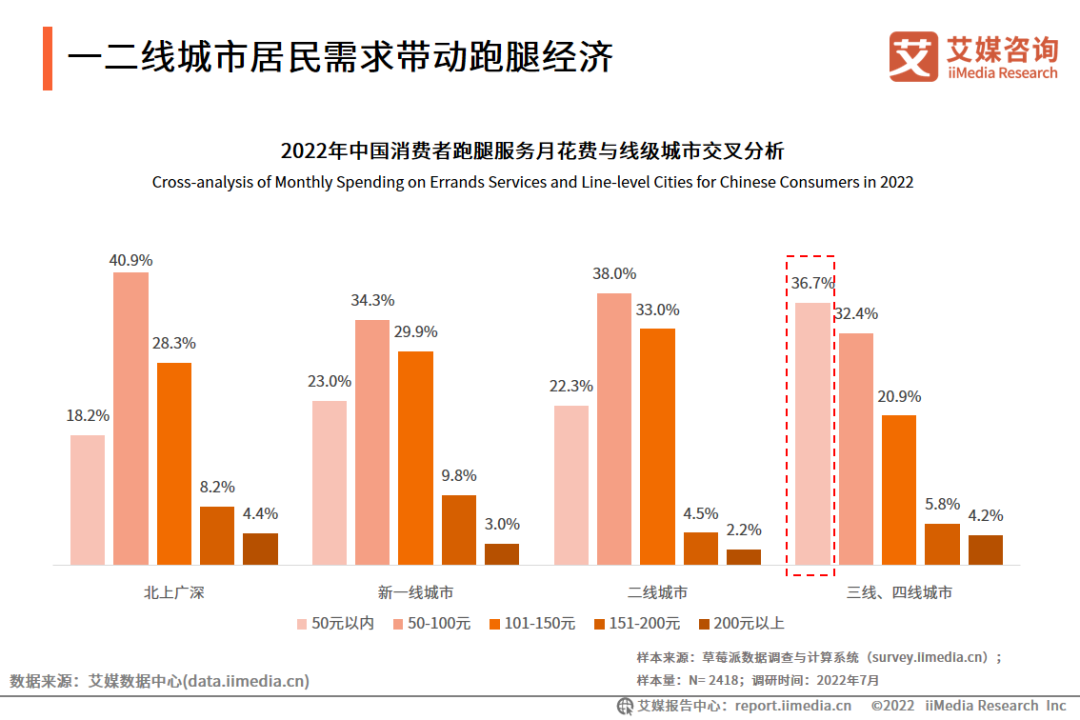 调研数据显示,在19-25岁消费者中,有37.4%每月使用跑腿服务1-4次;目前三线、四线及以下城市跑腿消费者占比仅为24%。艾媒咨询分析师认为,Z世代(出生于1995-2009年间)追求生活质量,乐于接受新事物,将逐步成为跑腿消费的主力军。而三四线城市的市场基础和规模并不亚于一二线城市,随着供需两端的发展,将成为跑腿经济的新机遇。