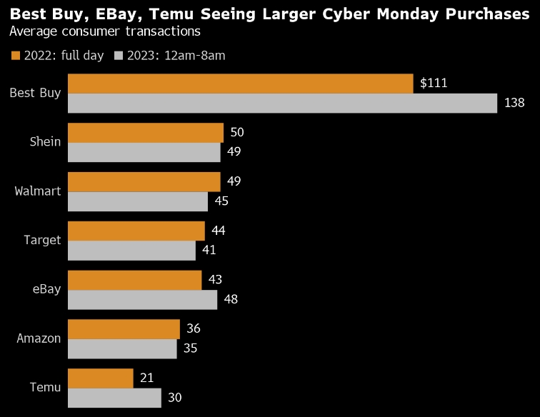 根据研究机构Attain汇编的数据,包括亚马逊、沃尔玛和 Target Corp.在内的多数大型零售商的销售额在网络星期一的前八个小时与去年同期相比略有下降。 百思买(Best Buy)、Temu和eBay是个例外,它们的早期购物平均交易规模都出现了增长。