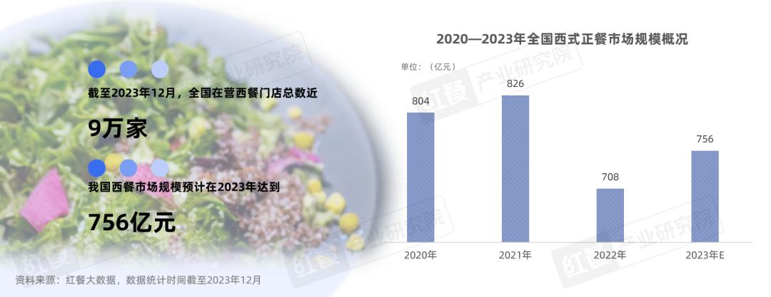 红餐大数据显示,2023年我国西餐市场规模有望达到756亿元,相比2022年上升了6.8%。截至2023年12月,全国在营西餐门店总数近9万家。
