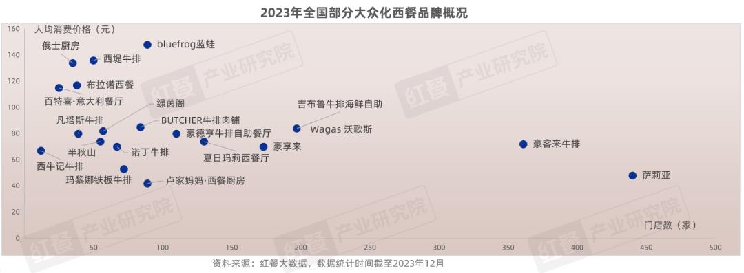 相比以单体店为主的精致西餐,大众化西餐的规模化程度较高。如萨莉亚、豪德亨牛排自助餐厅、夏日玛莉西餐厅、Wagas沃歌斯、豪客来牛排等已开出了数百家门店。