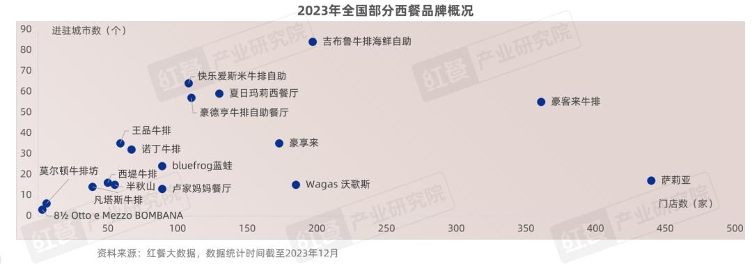 目前,西餐赛道有诸多表现较为亮眼的品牌,形成了国内品牌与国外品牌并存的格局,如来自日本的意式西餐品牌萨莉亚在内地已开出超400家门店,本土西餐品牌豪客来牛排已开出了超350家门店;其他本土品牌如Wagas沃歌斯、豪德亨牛排自助餐厅、夏日玛莉西餐厅等也已开出超100家门店,进驻城市数超10个。