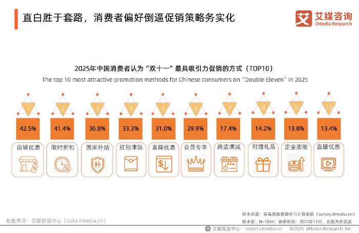 iiMedia Research(艾媒咨询)数据显示,“双十一”促销方式多样,42.5%的消费者认为最具有吸引力的“双十一”促销方式为店铺优惠,其次是限时折扣(41.4%)和国家补贴(36.8%)。艾媒咨询分析师认为,消费者对促销方式的偏好,折射出电商行业促销逻辑的深刻转变。经过多年市场教育,大众已从追逐流量导向的复杂套路转向更看重直接、透明的让利,未来平台与商家需更聚焦于简单务实的优惠设计,以匹配消费者对“真实价值”的需求。