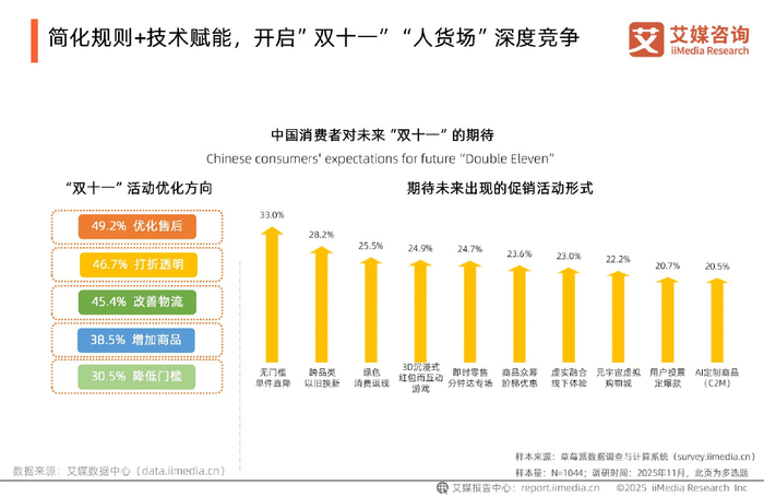 iiMedia Research(艾媒咨询)数据显示,在“双十一”活动方面,49.2%的消费者希望优化售后服务;在促销形式上,33.0%的消费者希望能够有无门槛直降的新形式。艾媒咨询分析师认为,平台与商家既要简化规则、强化物流及售后等服务基建,也要借力AI、即时零售等新技术,探索无门槛直降、虚实融合等多元创新模式,以推动行业迈入“人货场”重构的深度竞争阶段,进而重塑行业增长逻辑。