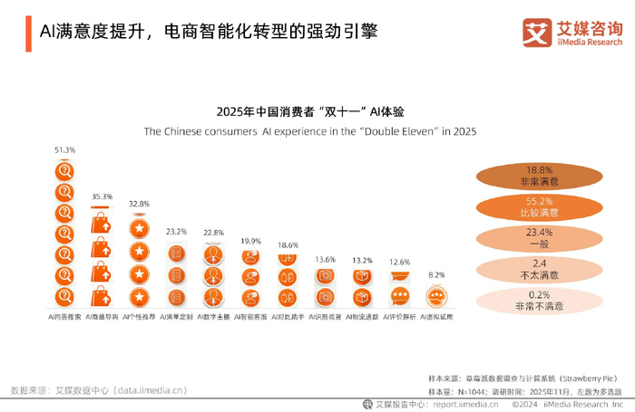 iiMedia Research(艾媒咨询)数据显示,“双十一”期间,超半数(51.3%)的消费者体验过AI问答搜索,超七成的消费者对AI的体验感到满意。艾媒咨询分析师认为,消费者对电商平台AI功能的整体满意度,将推动行业加速AI技术与消费全链路场景的深度融合。这一趋势不仅将驱动服务模式向智能化、个性化升级,更将成为电商行业未来提升用户体验、构建核心竞争力的关键驱动力。