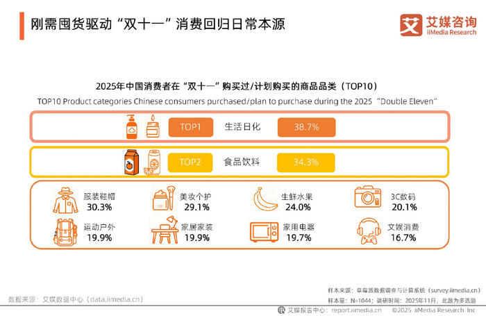 iiMedia Research(艾媒咨询)数据显示,“双十一”消费者购买最多的商品是生活日化类(38.7%),其次是食品饮料(34.3%)。艾媒咨询分析师认为,生活日化与食品饮料作为高频刚需品,“双十一”期间消费者集中囤货行为显著,反映出电商行业正从非必需性消费向日常高频需求倾斜的趋势,这将推动品牌更注重产品性价比与供应链效率,强化用户长期消费粘性。