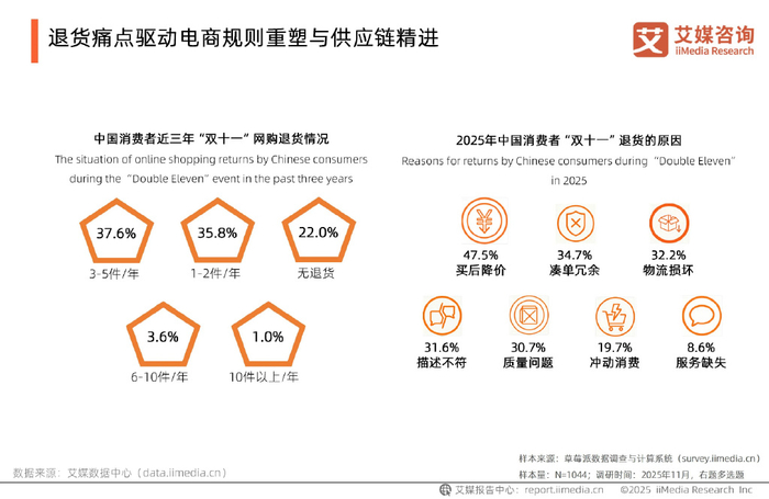iiMedia Research(艾媒咨询)数据显示,近三年“双十一”网购中,有37.6%消费者每年退货3-5件;买后降价(47.5%)是消费者在“双十一”期间退货的最主要原因。艾媒咨询分析师认为,消费者“双十一”退货数据反映出的买后降价、凑单冗余及物流质量等核心问题,将倒逼电商行业优化促销规则、强化价格稳定性与供应链能力,推动行业从“流量驱动”向“体验驱动”转型。