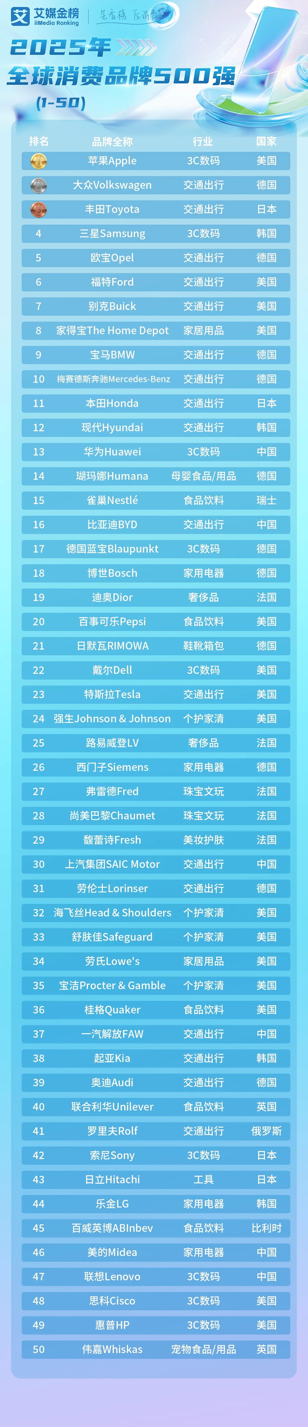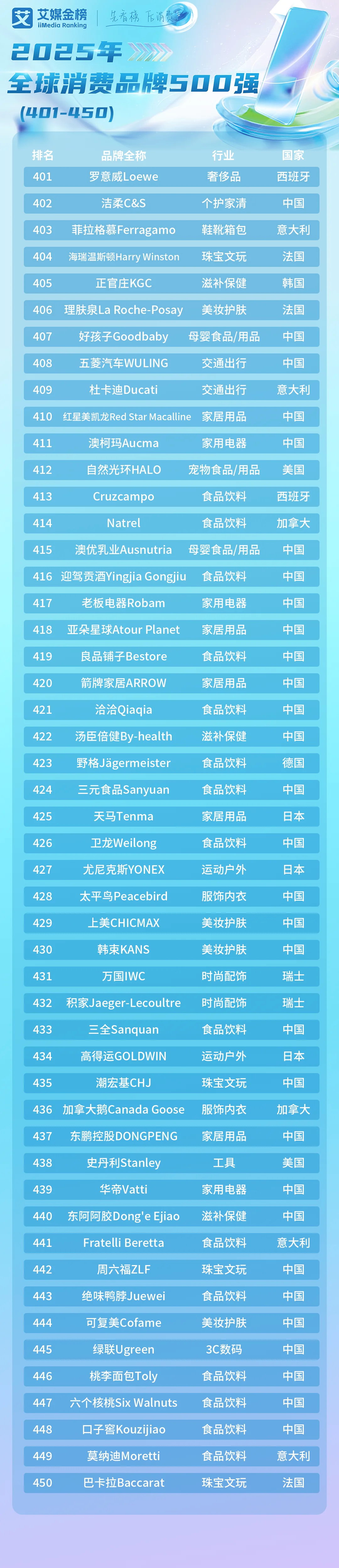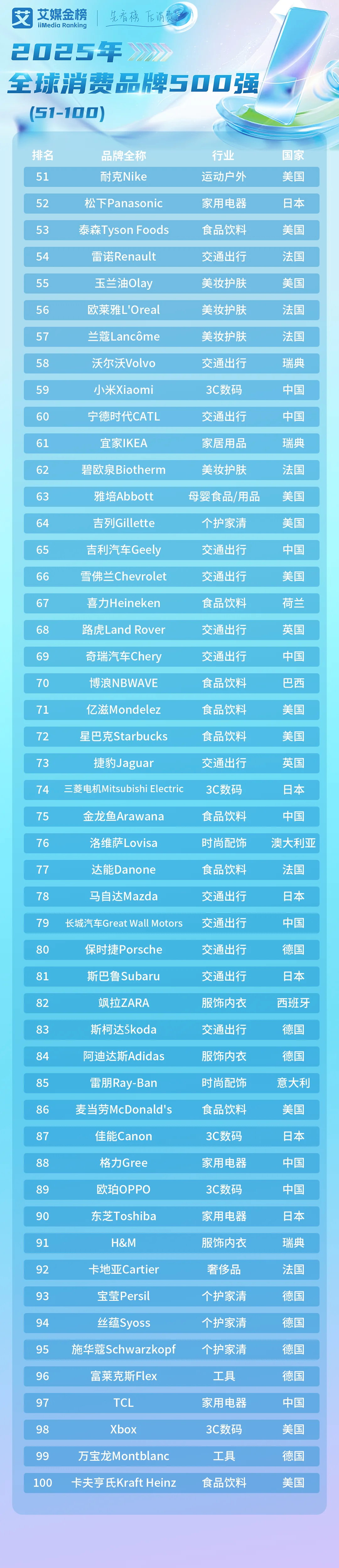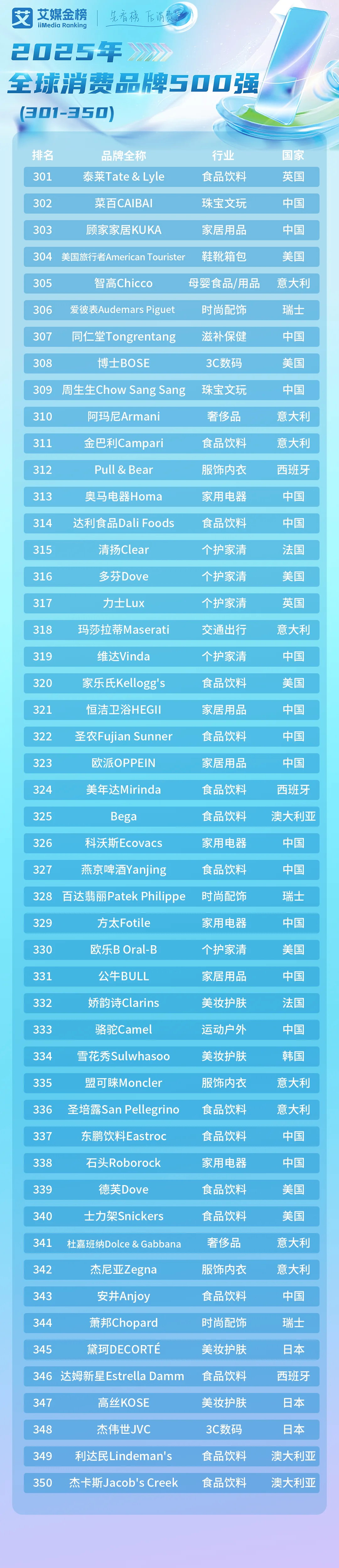 iiMedia Ranking(艾媒金榜)正式发布《2025年全球消费品牌500强》,以权威视角展现全球消费品牌发展格局,为洞察行业态势、把握市场机遇提供重要参考与价值支撑。