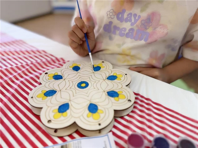 手绘体验环节,更是亲子情感与文化传承的双重升华。孩子们专注地给敦煌鼓上的经典纹样上色,家长们在旁耐心协助调色、勾勒,偶尔的轻声交流与默契配合,让现场满是温馨。当一个个独一无二、承载着千年丝路美学的敦煌鼓在亲子协作中诞生,孩子们轻轻敲击鼓面,清脆的鼓声穿越时空,仿佛在回应千里之外敦煌石窟的文明回响,更在诉说着 “光明与传承” 的美好约定。